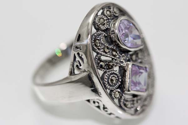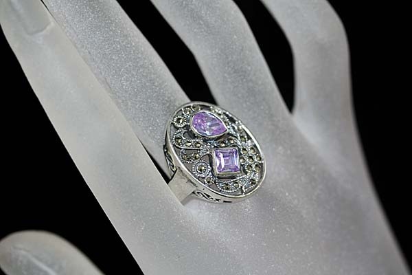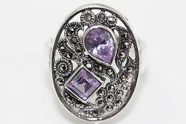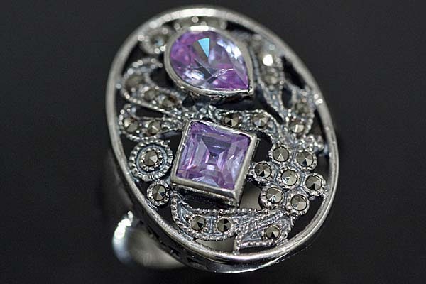楕円にプリンセスとペアシェープ型の合成石をセットしたオシャレリング。