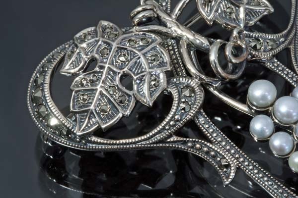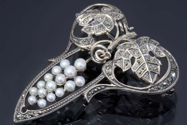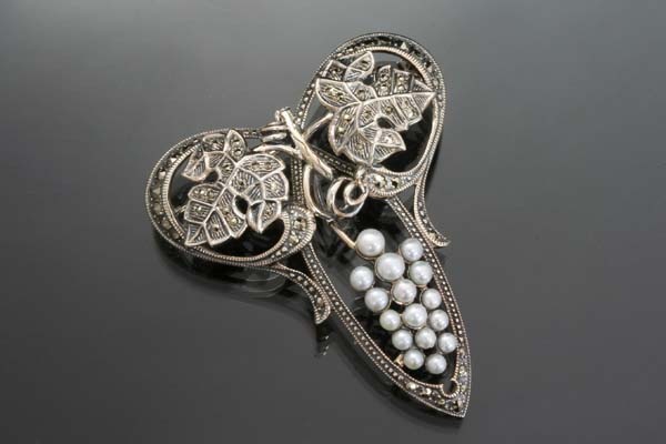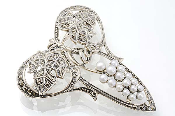 アンティークジュエリーの美しさの再現追及に余念のない「碌山」のアーティスティックな葡萄の房のデザインブローチ。 粒ぞろいのパールを葡萄の実に、マーカサイトが煌く蔓や葉がロマンティックな雰囲気を醸し出します。 ブローチはお洒落上級者にオススメです。