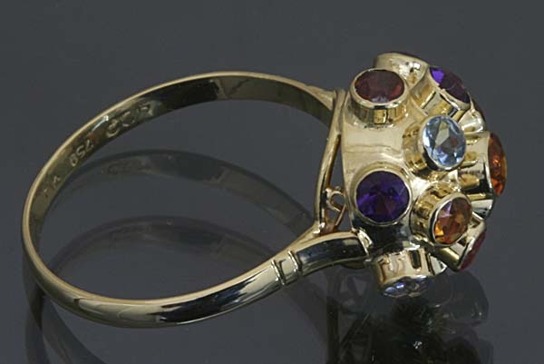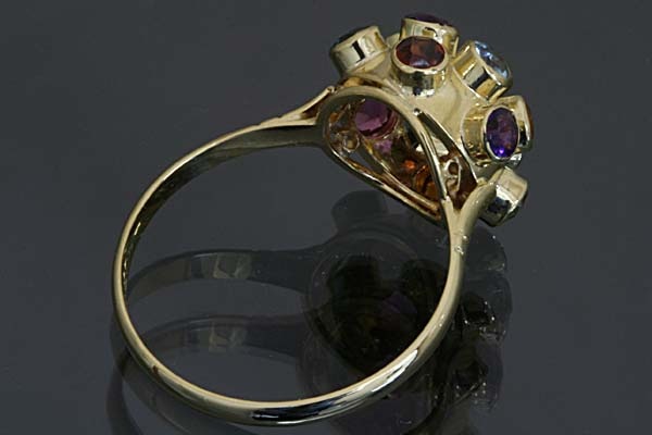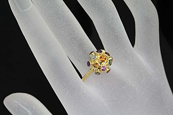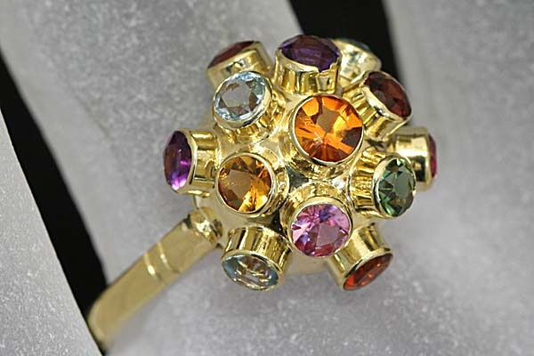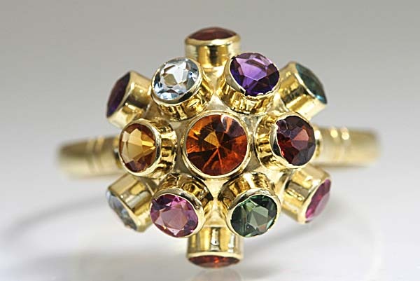色とりどりの宝石を立体的にセットした、キュートでアーティスティックなセミアンティークリングです。
